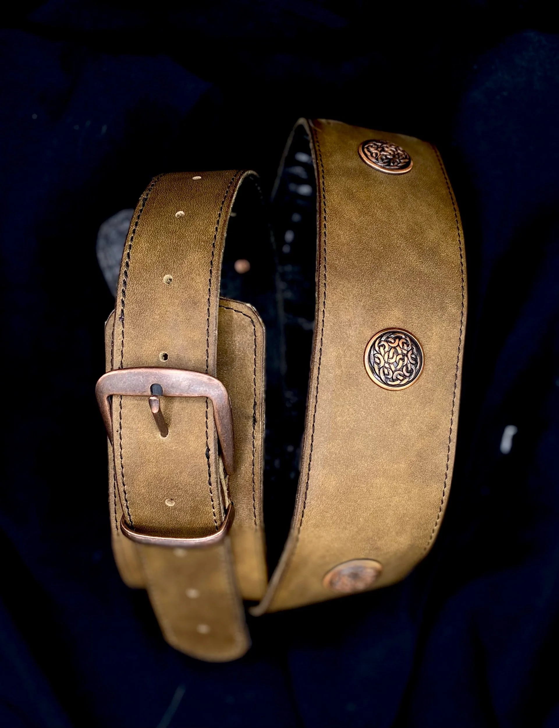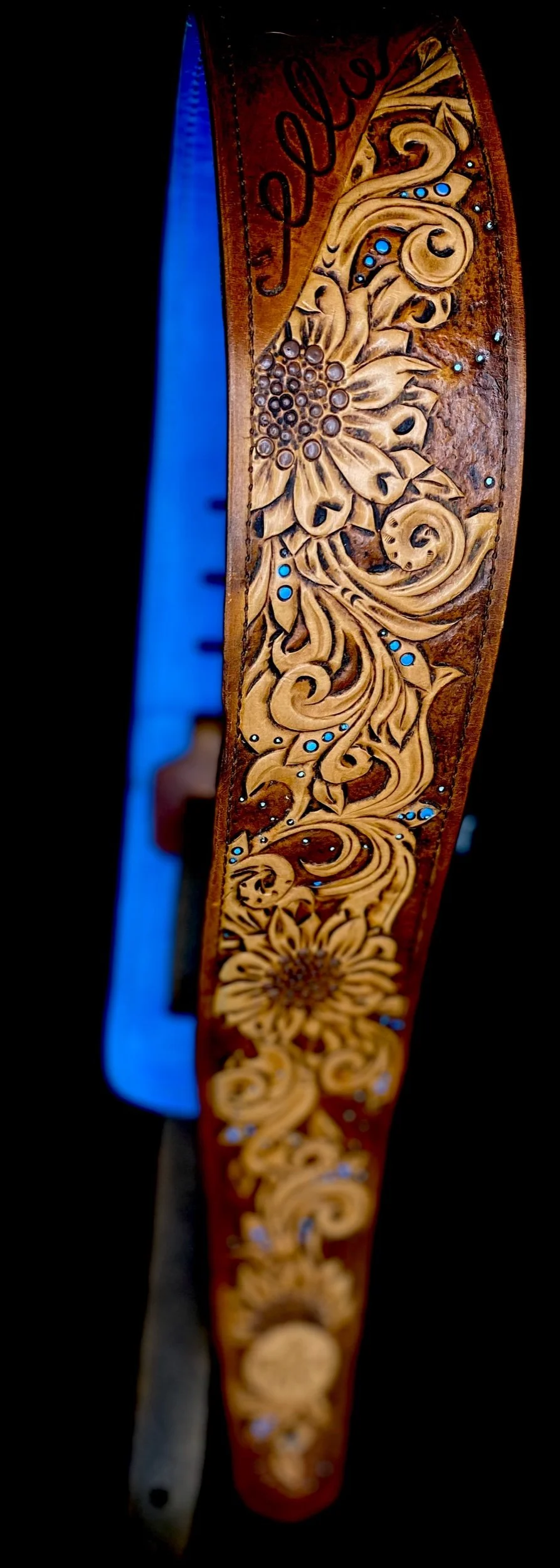 Leather guitar straps with light memory foam padding at shoulder. These are custom art tooled leather, drawn, dyed, painted and finished by hand.