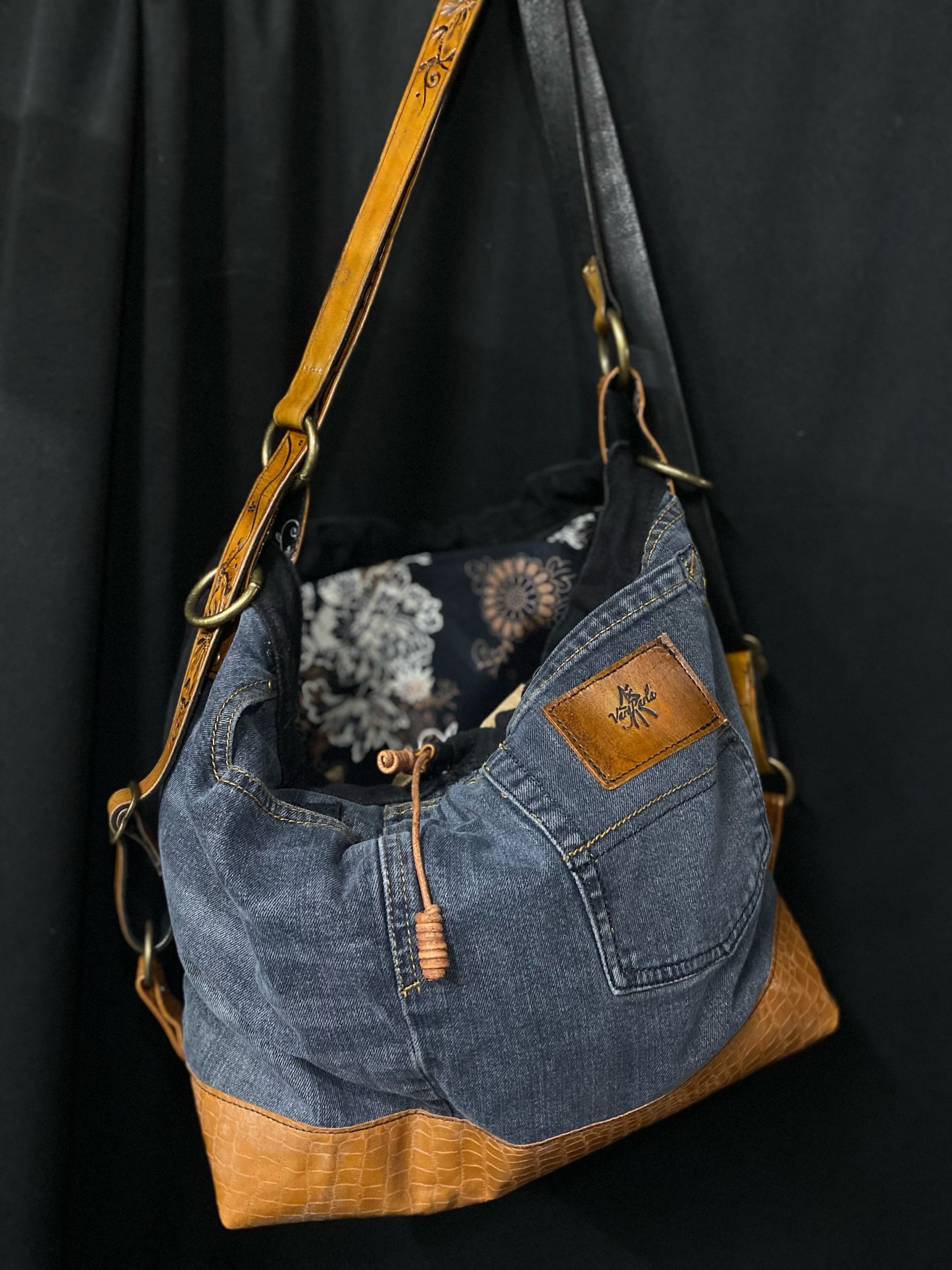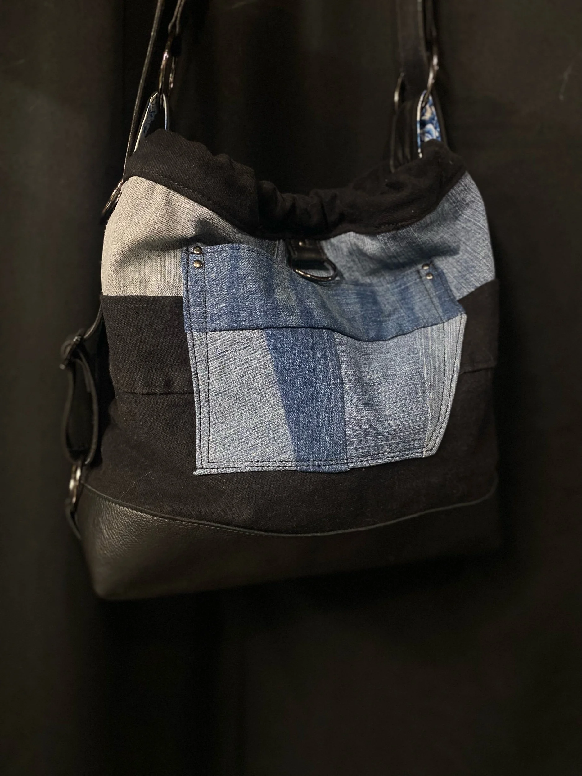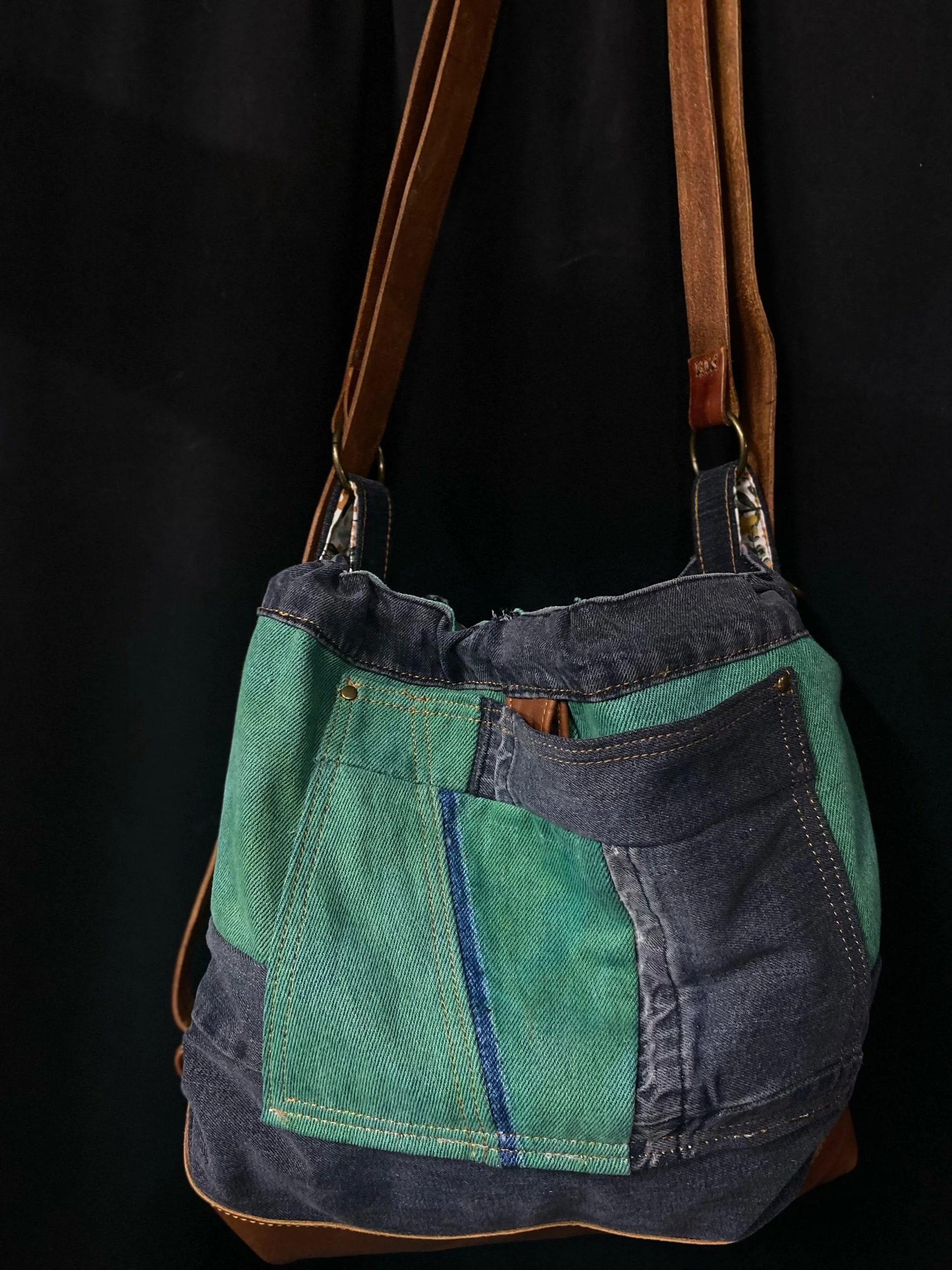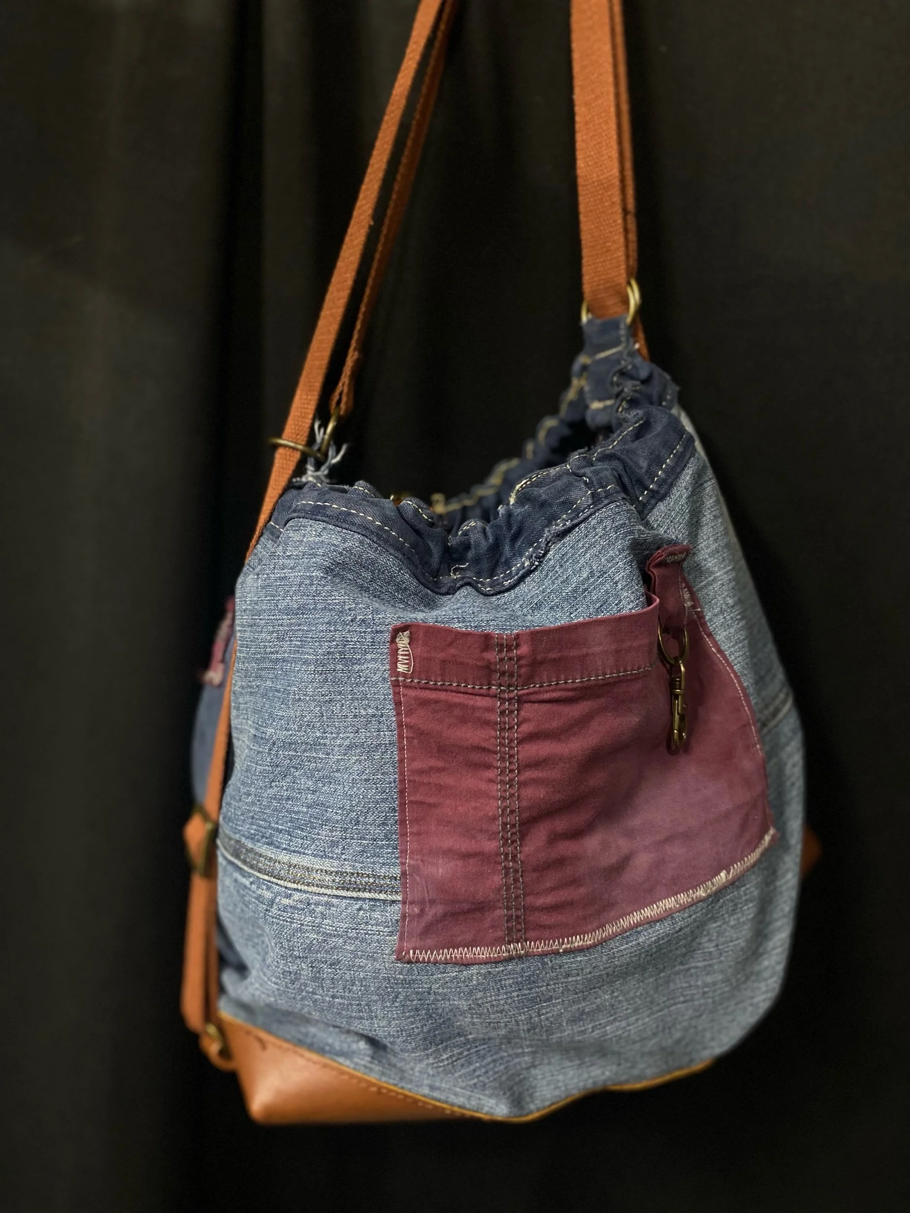 Crafted from reclaimed denim and premium salvaged leather, this versatile bag blends rugged character with modern functionality.