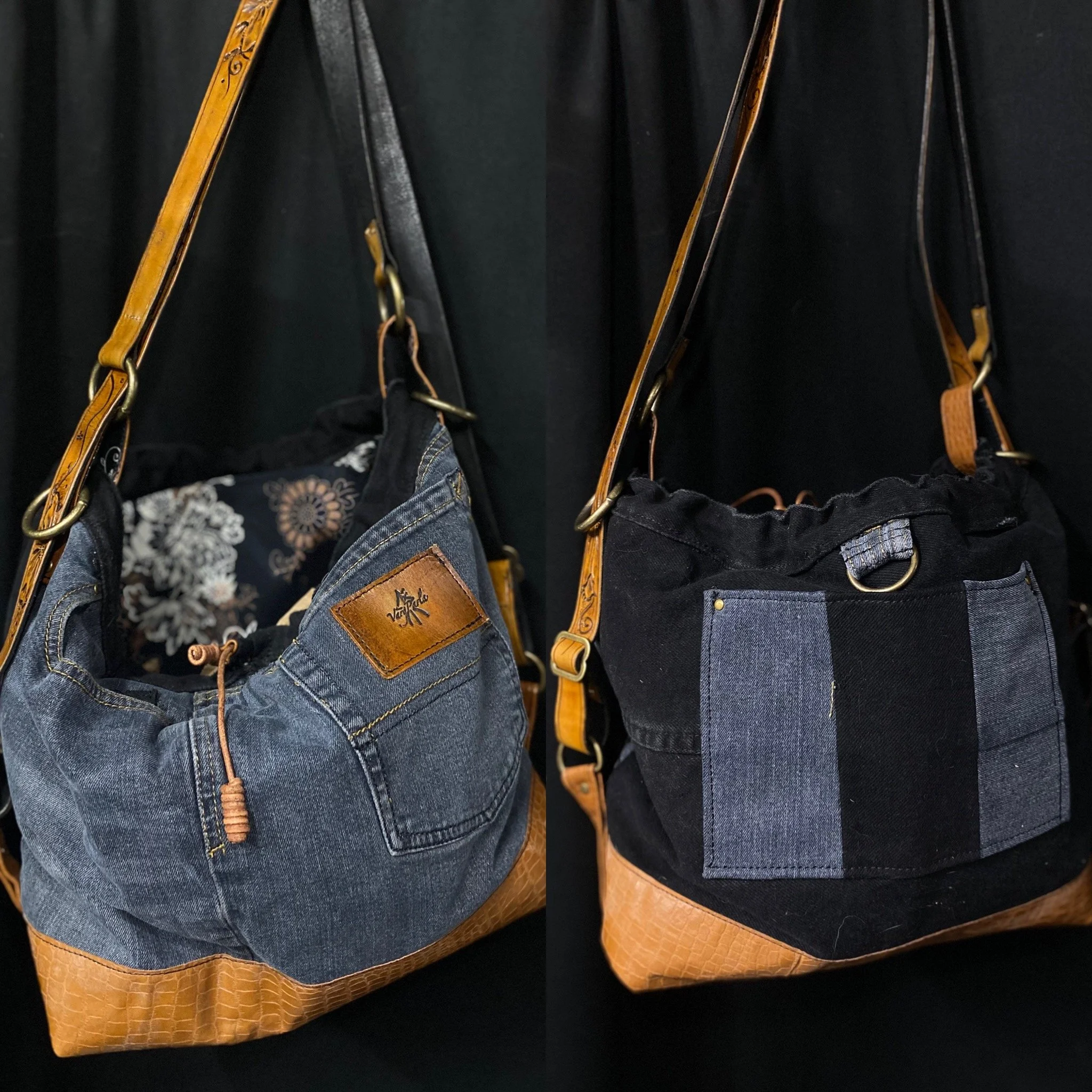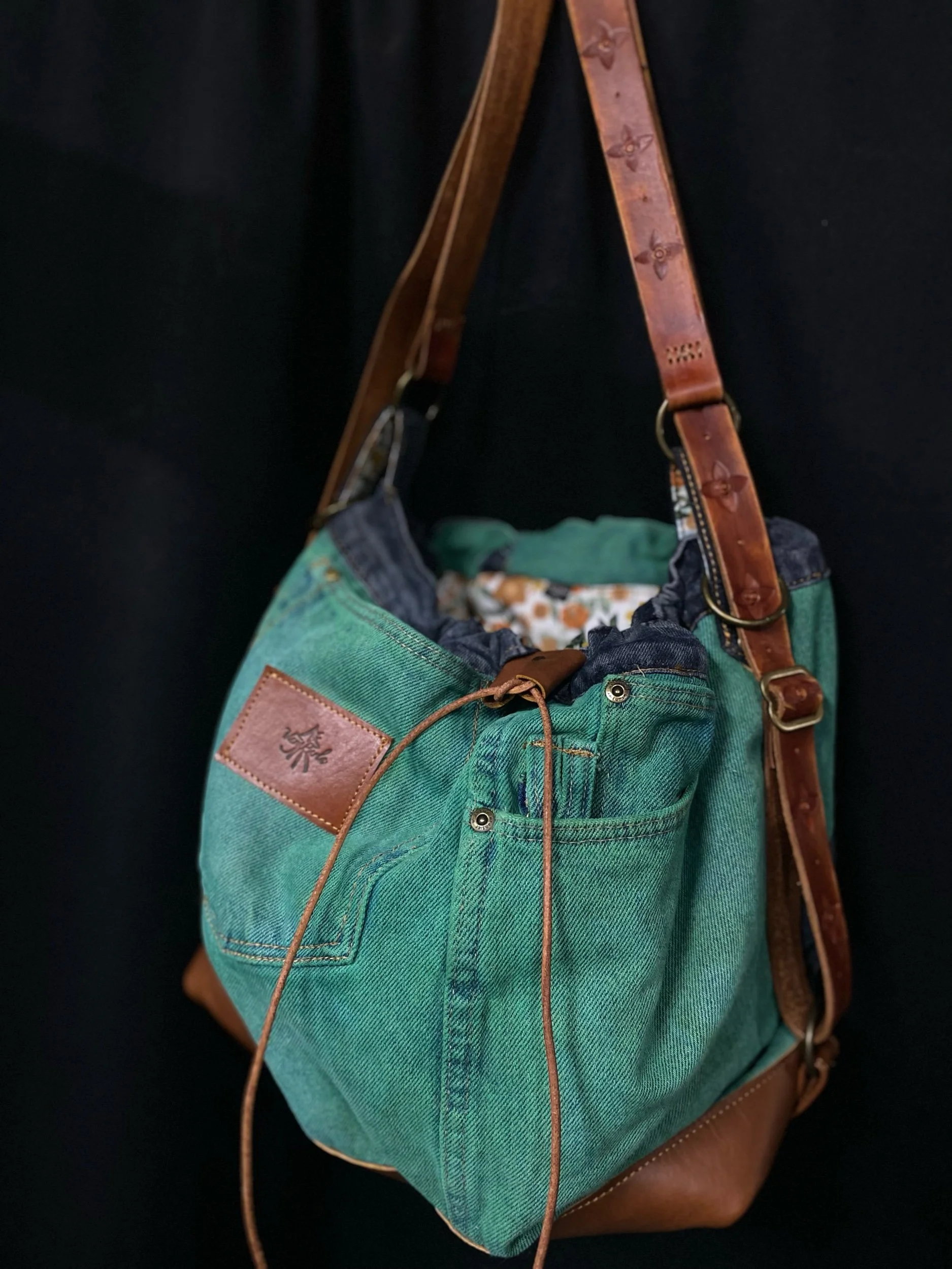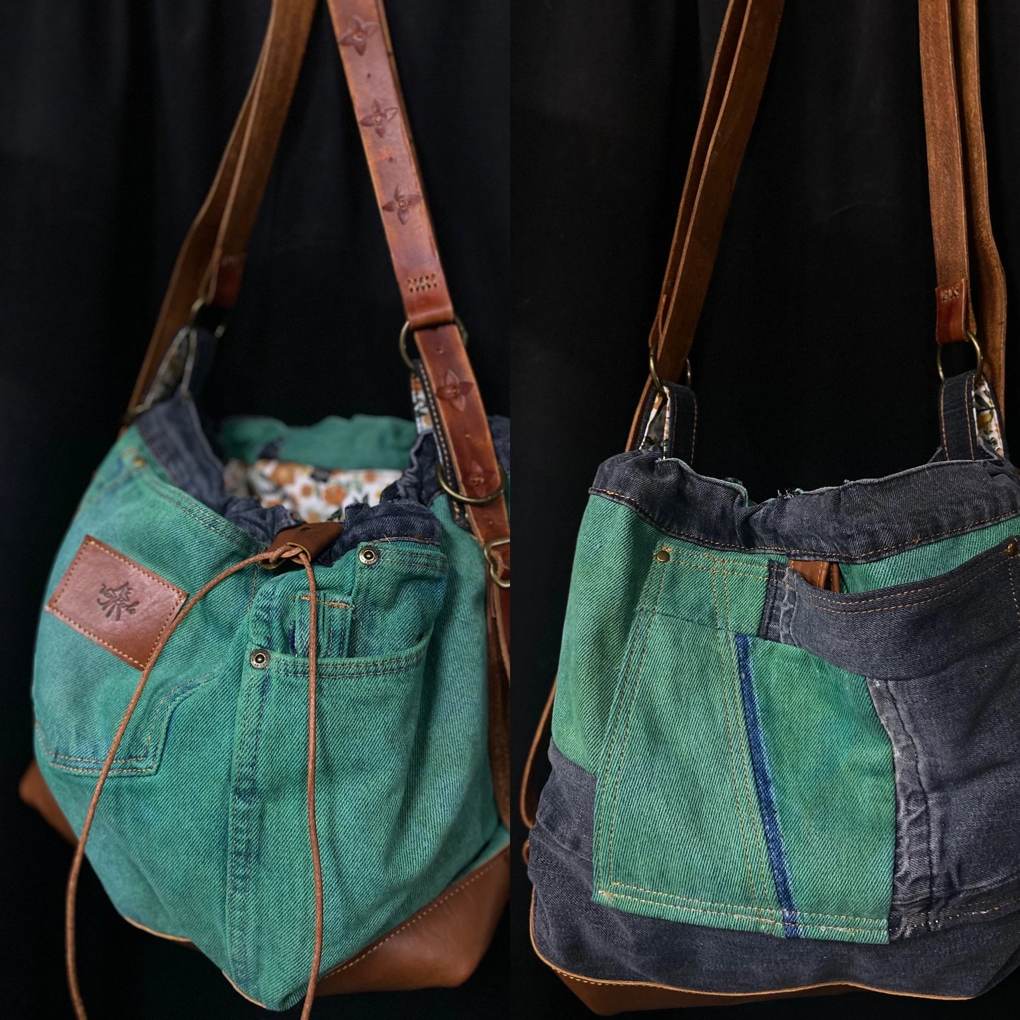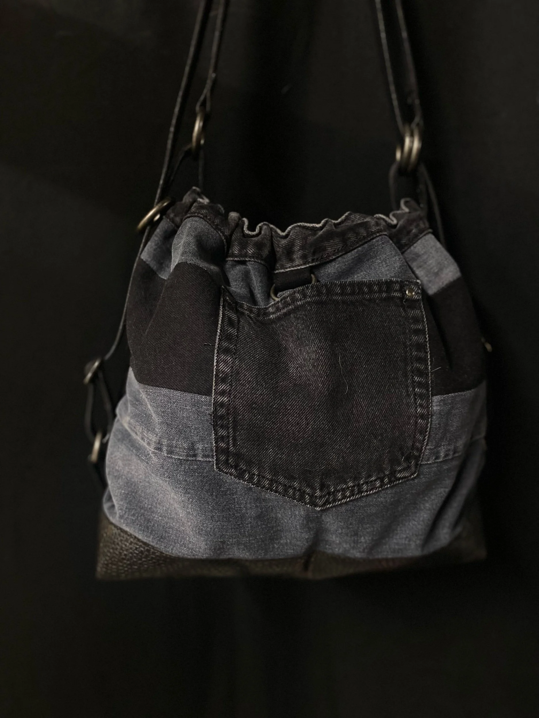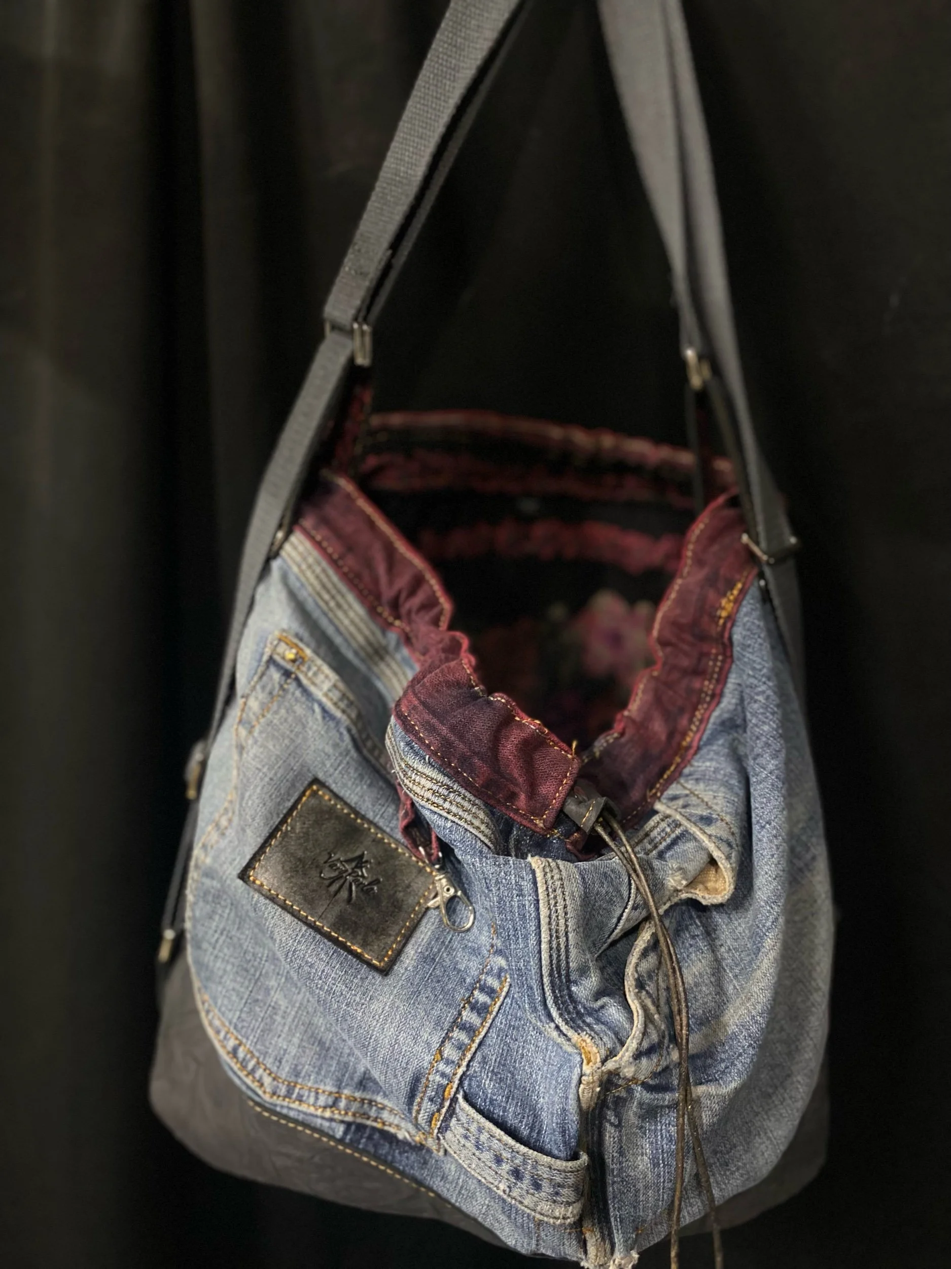 Crafted from reclaimed denim and premium salvaged leather, this versatile bag blends rugged character with modern functionality.