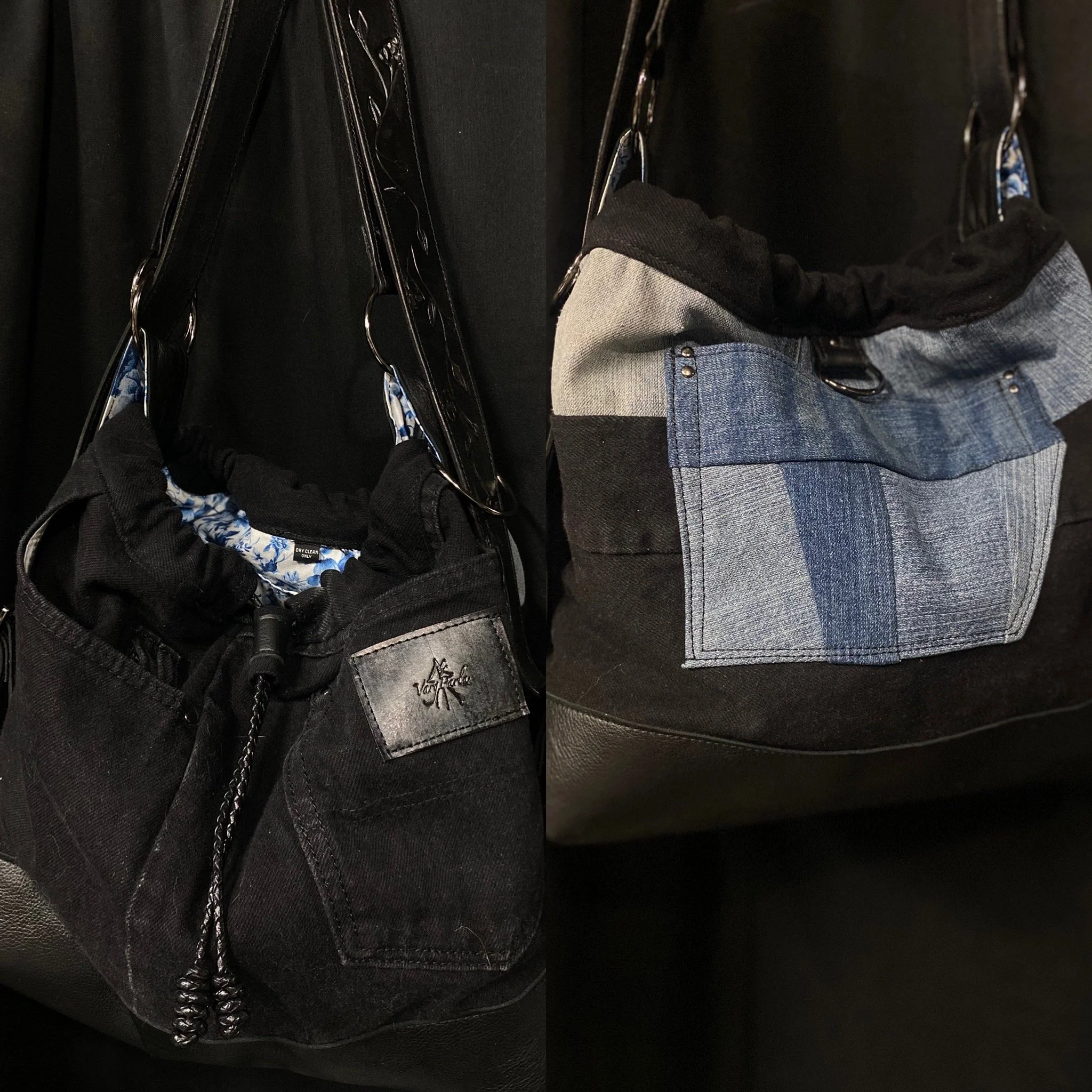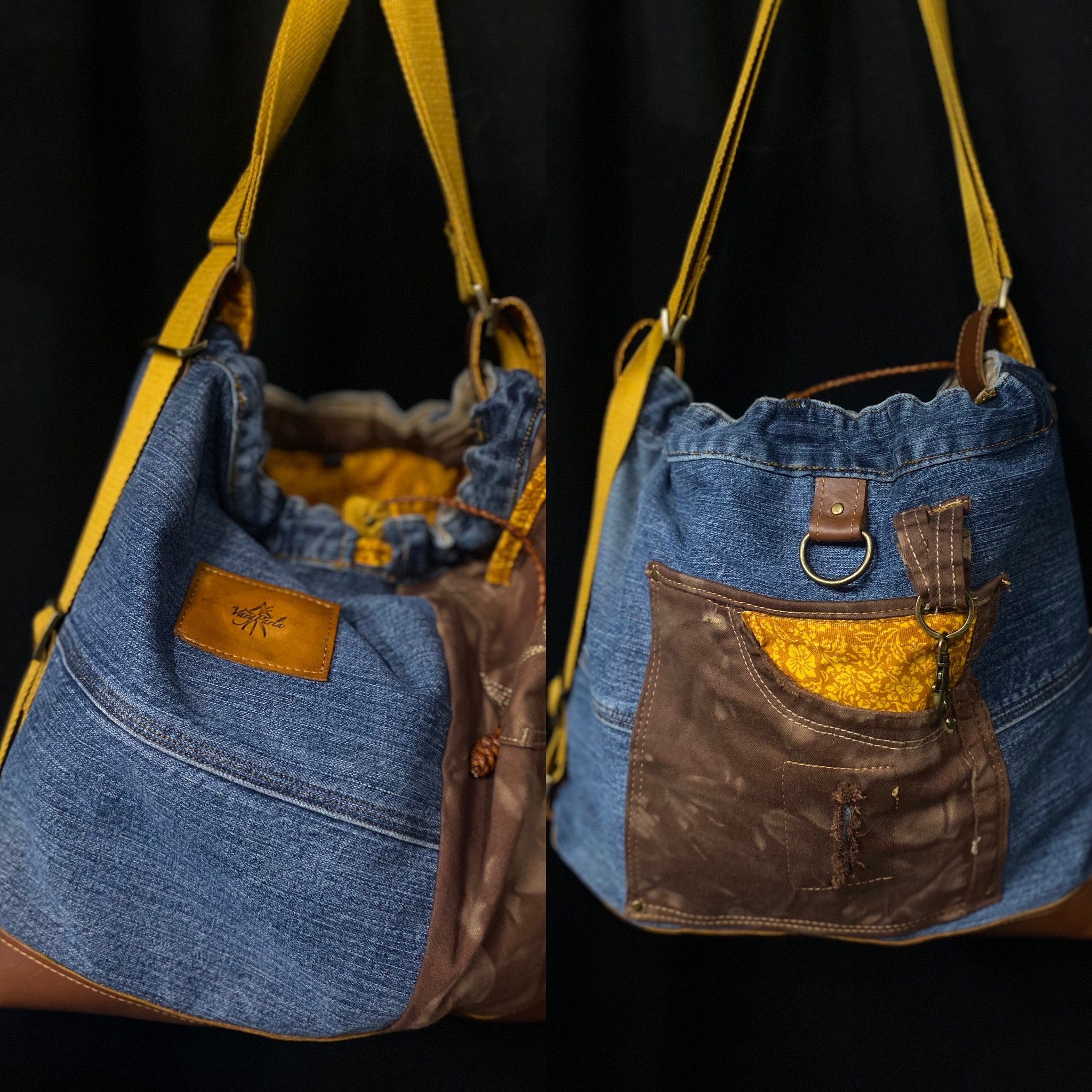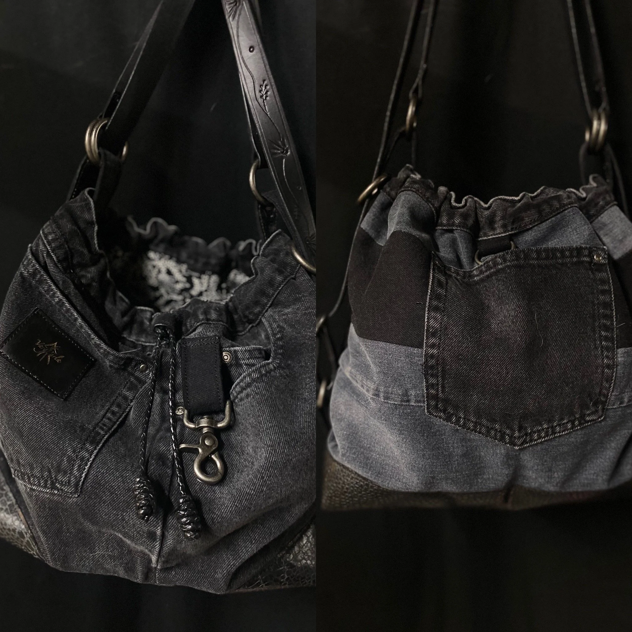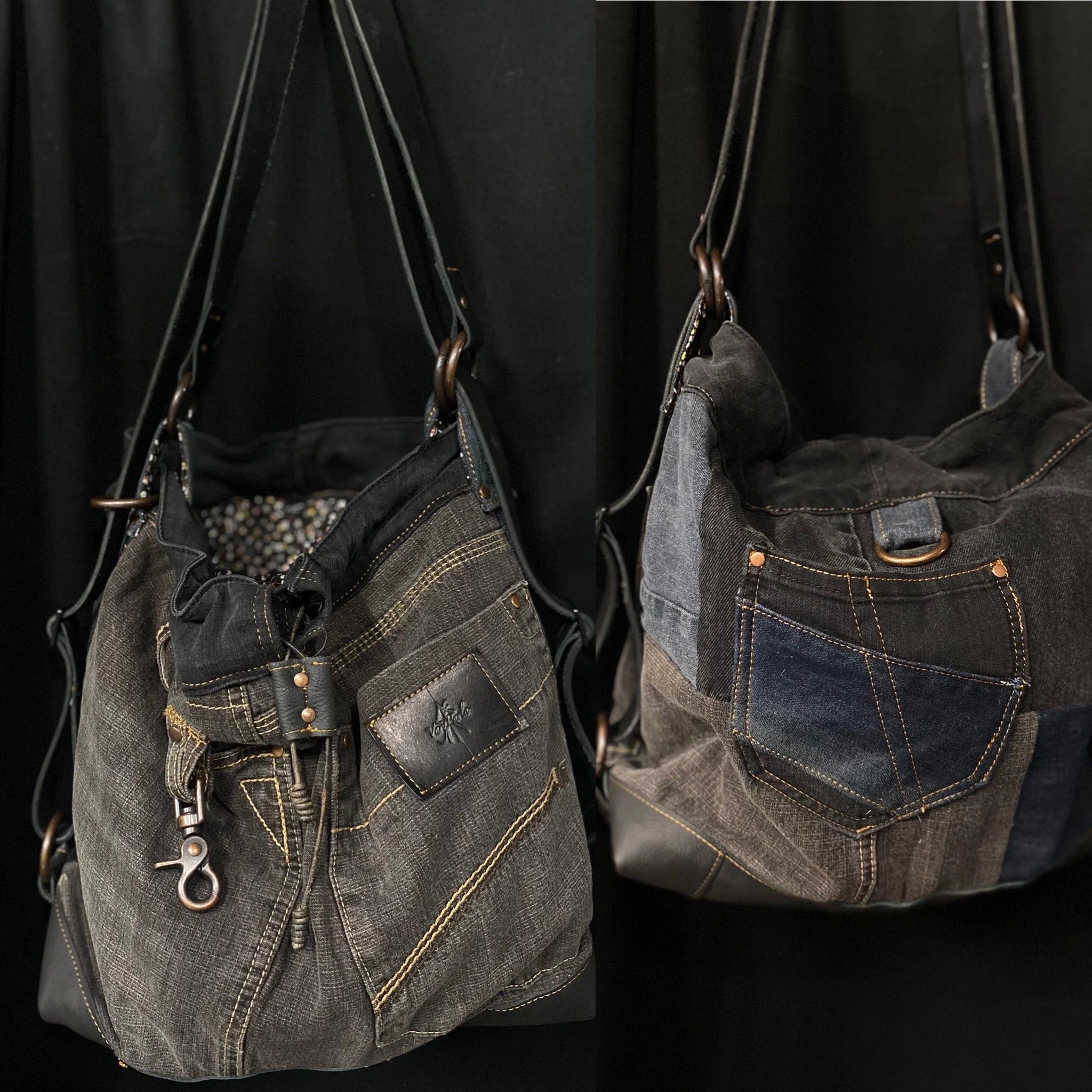 Crafted from reclaimed denim and premium salvaged leather, this versatile bag blends rugged character with modern functionality.